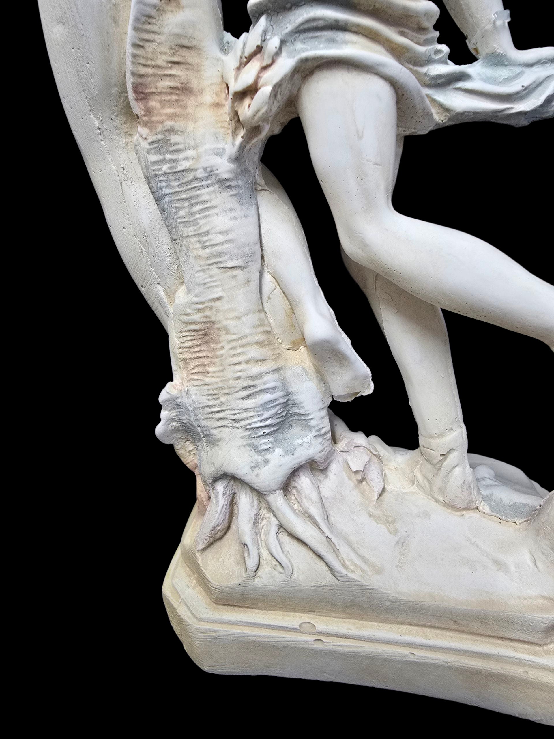 Imported from Greece, this exquisite alabaster sculpture captures one of the most dramatic moments in classical mythology — the transformation of Daphne as told in Ovid’s Metamorphoses. Struck by Cupid’s golden arrow, Apollo is consumed with love and pursues the nymph Daphne, who, pierced by a lead arrow, flees in rejection. In desperation, she calls upon her father, the river god Peneus, who transforms her into a laurel tree to preserve her chastity.