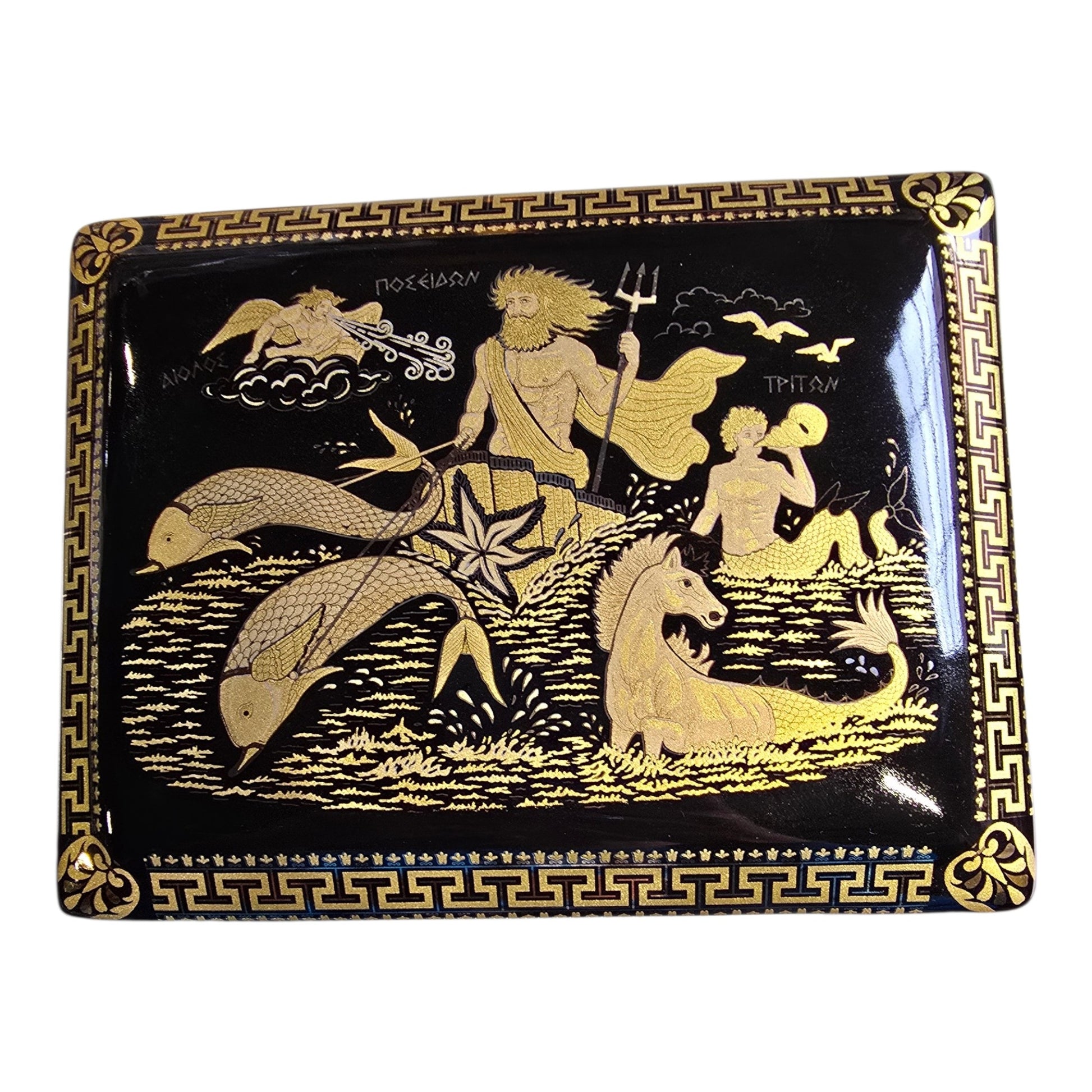 This exquisite handmade ceramic jewelry box showcases the beauty of traditional Greek craftsmanship and mythology. Finished in elegant black with 24K gold detailing, the artwork features Poseidon, the powerful god of the sea, wielding his iconic trident. Surrounding him are rich mythological elements including Triton, the messenger of the sea blowing his conch shell, graceful dolphins, and a majestic hippocampus (the legendary half-horse, half-fish sea creature). 🌊